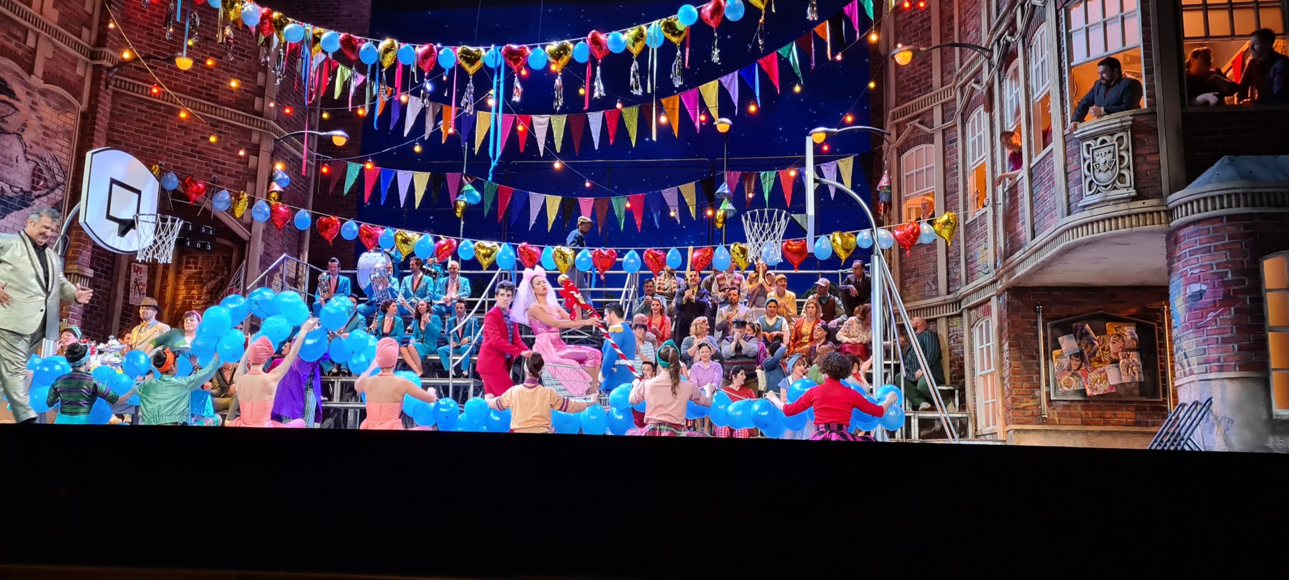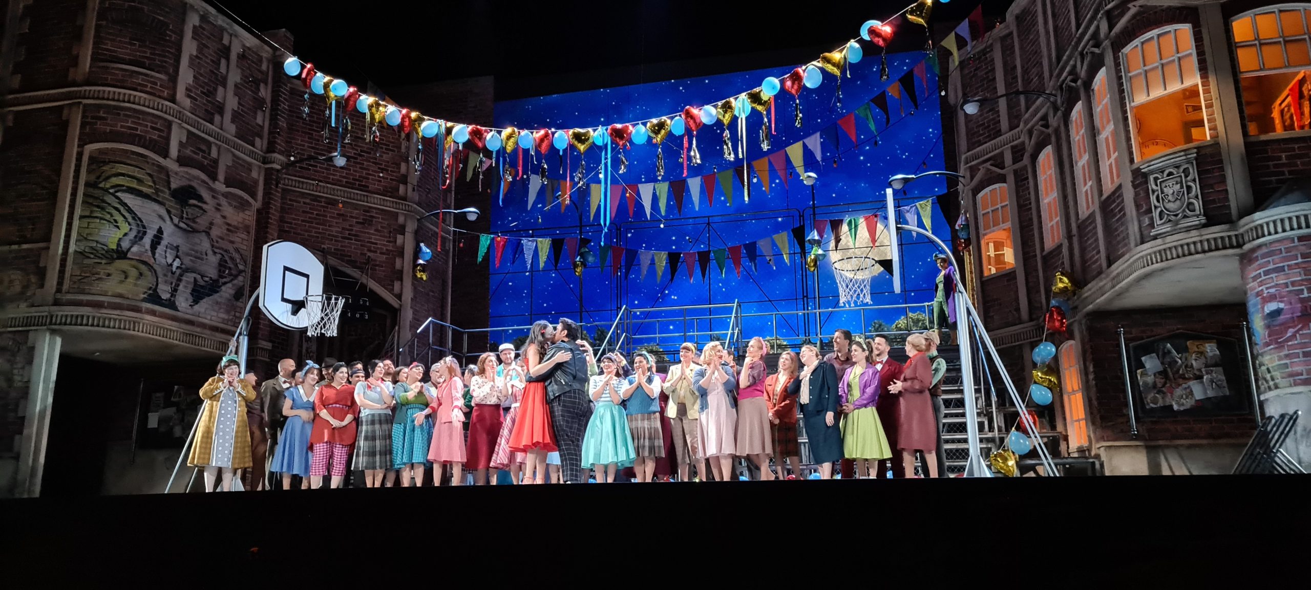 Ambientada en los años 50 y en el entorno de una high school americana, la opera se desarrolla en un ambiente festivo y alegre con las voces de los principales roles en estado de gracia. De hecho Camarena, menos en el estreno, bisó su «furtiva lagrima» en todas las representaciones. Lleno a rebosar el teatro rompió en aplausos en muchos momentos de la representación acabando la misma con una grandísima ovación que duró varios minutos acompañada de un clamor de bravos.